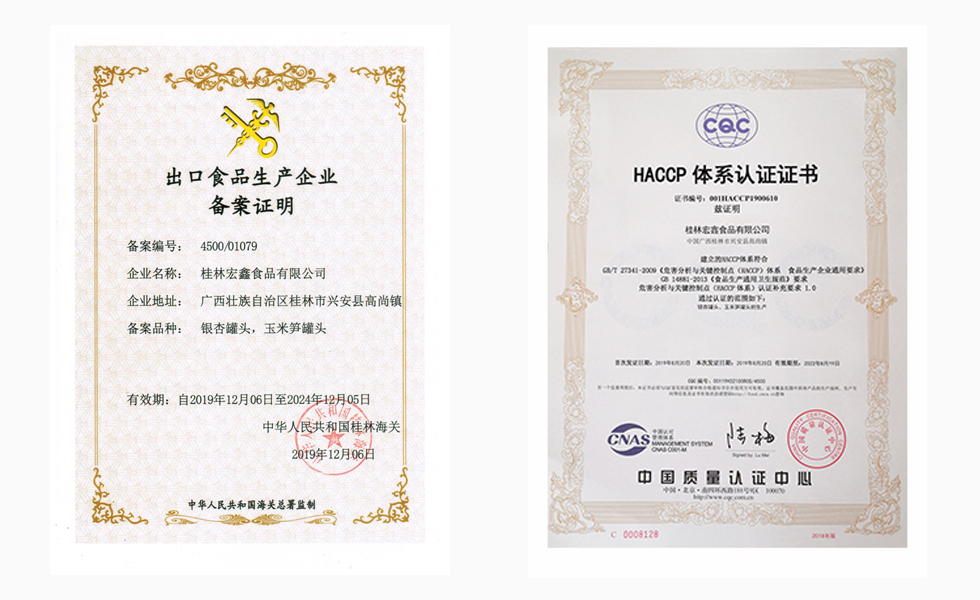 桂林宏鑫食品有限公司通過出口食品生產(chǎn)企業(yè)備案,獲得HACCP體系認證,具備進口貿(mào)易資質。銀杏罐頭大量出口至日本、中國臺灣、香港、新加坡、泰國、澳洲等,是全球規(guī)模大的銀杏罐頭加工廠。
